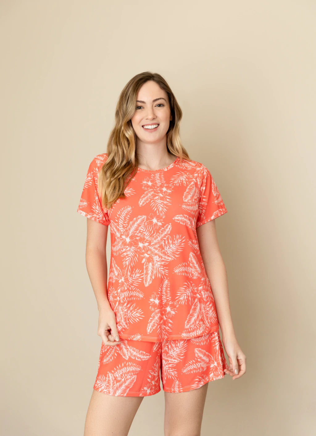 Blusa meia manga, short com elástico na cintura. Tecido leve, toque gelado.